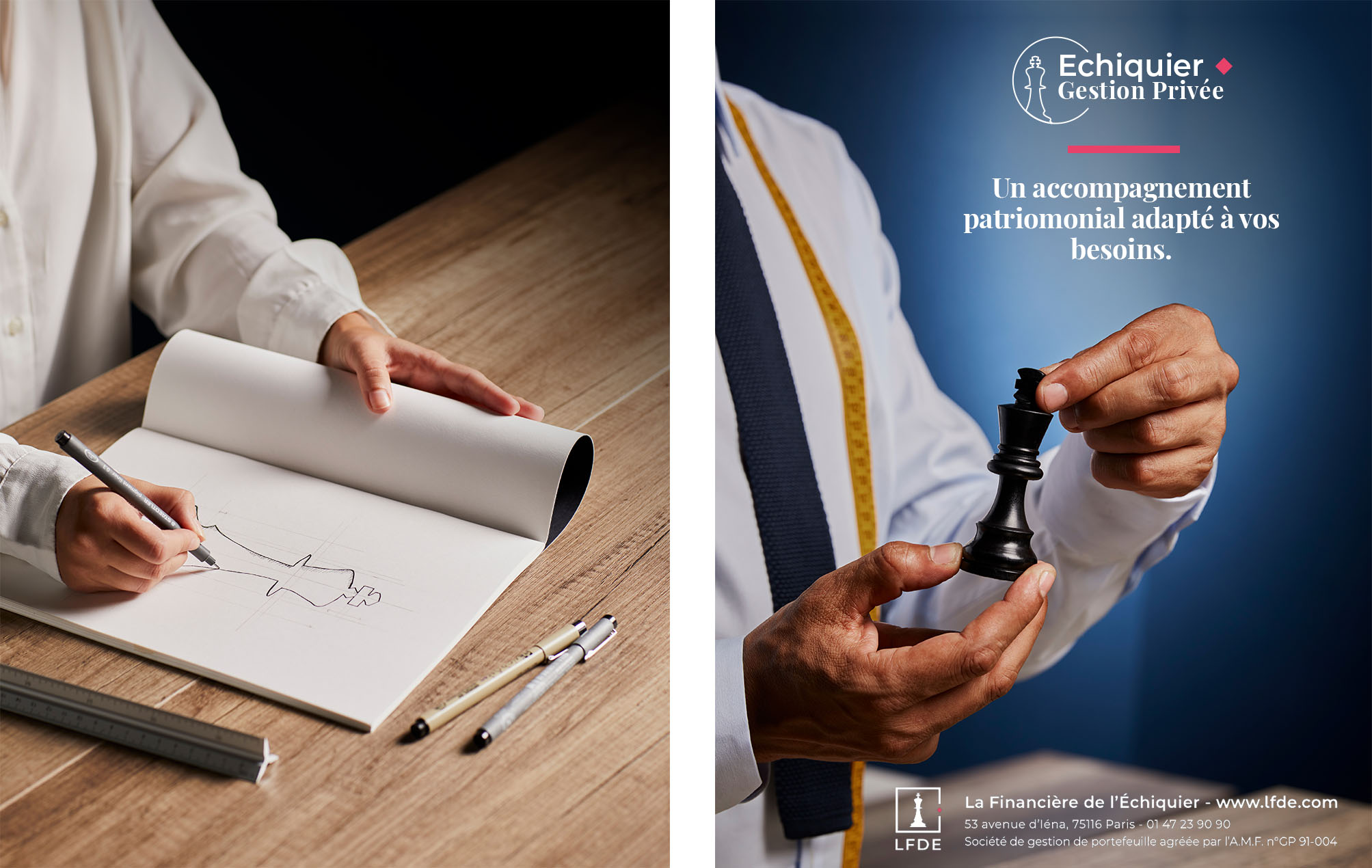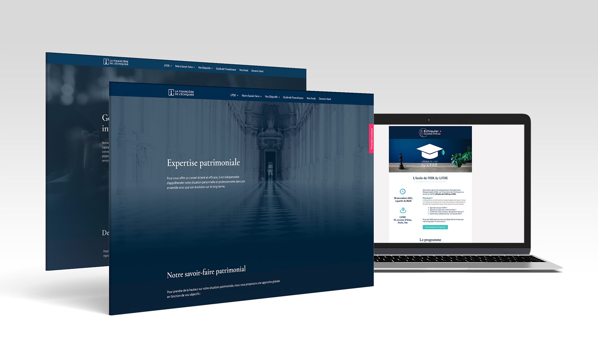 Développée au sein de La Financière de l’Échiquier dans le cadre de la refonte du site internet dédié aux clients particuliers, Echiquier Gestion Privée se positionne comme une marque ombrelle haut de gamme. Du logo jusqu'au spot TV, ce projet a été décliné sur l'ensemble des supports concernés.