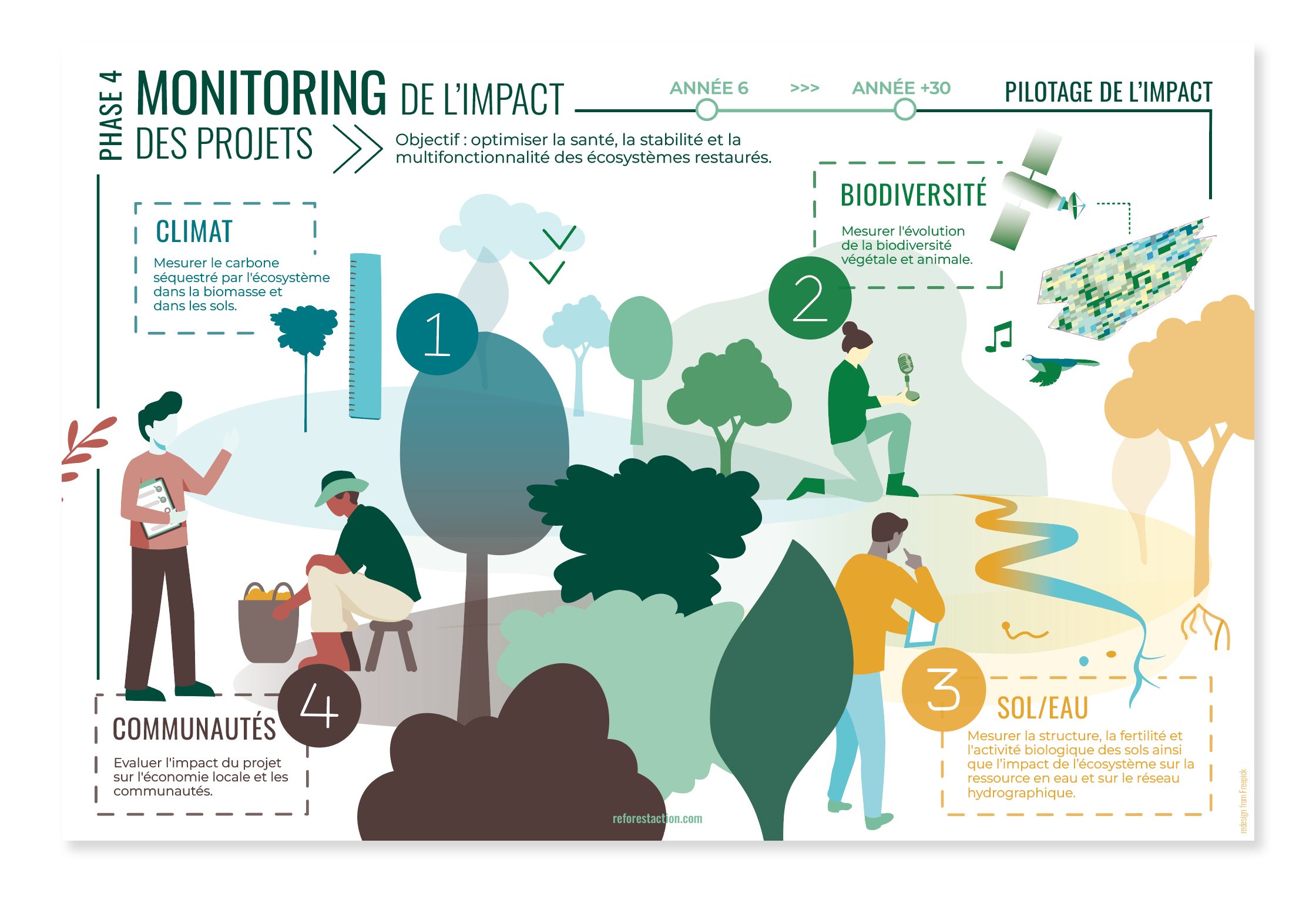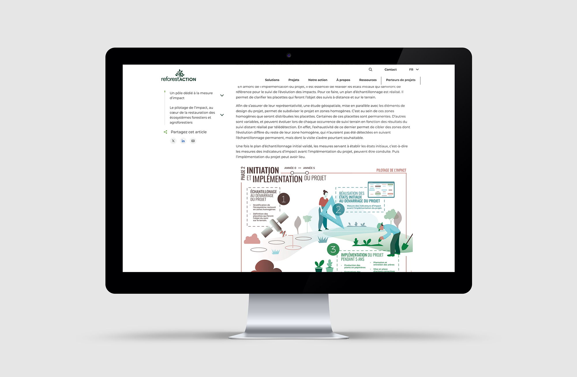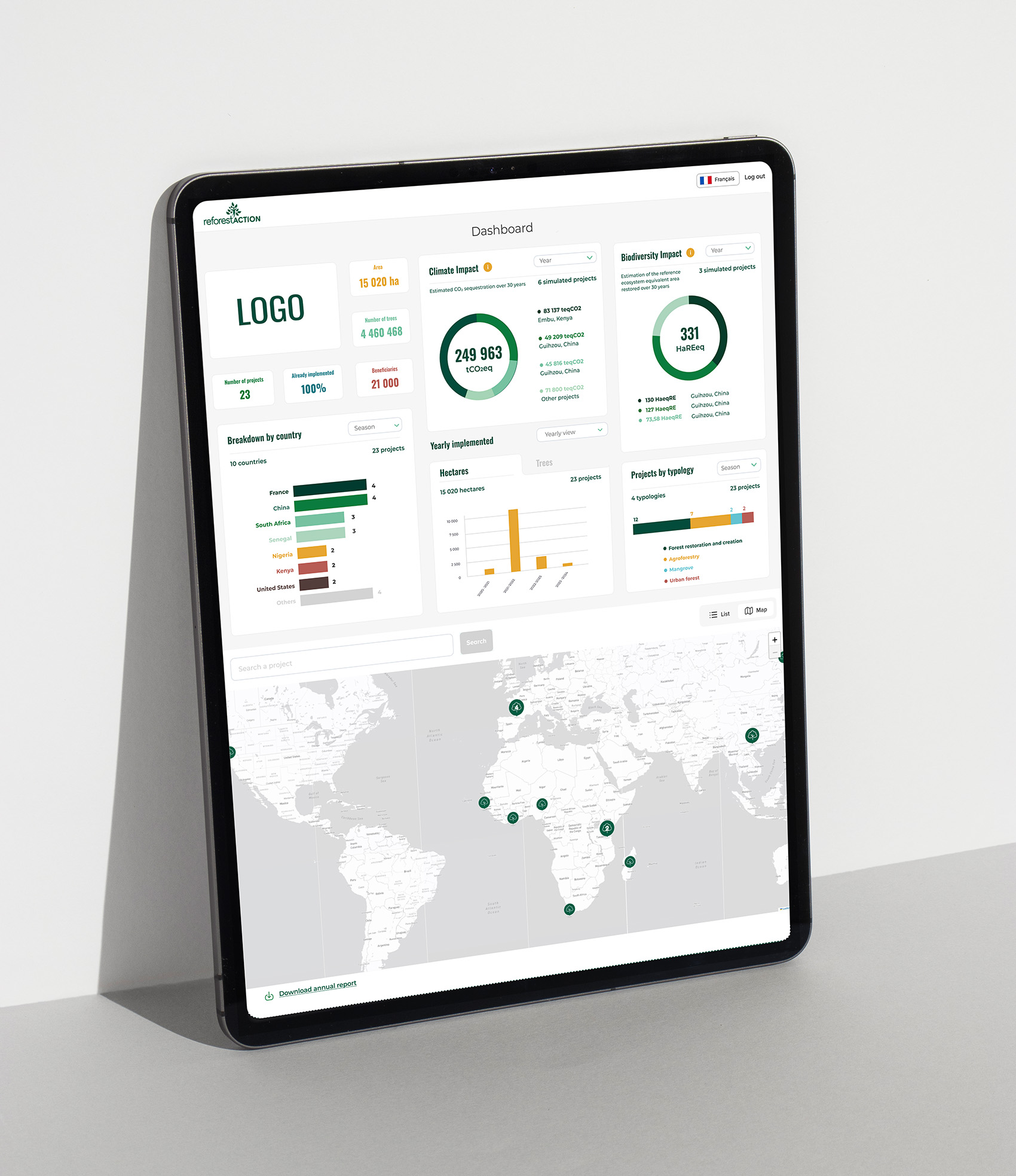 Développée au sein de Reforest'Action, la plateforme de pilotage des écosystèmes est destinée aux clients pour assurer la transparence et surveiller l'évolution des projets. Réalisé en collaboration avec l'équipe Tech, le travail de design d'interface consistait à hiérarchiser l'information, donner une vision claire de l'ensemble des outils et garantir une expérience utilisateur optimale. Des illustrations ont également été créées pour communiquer sur les outils et la plateforme.