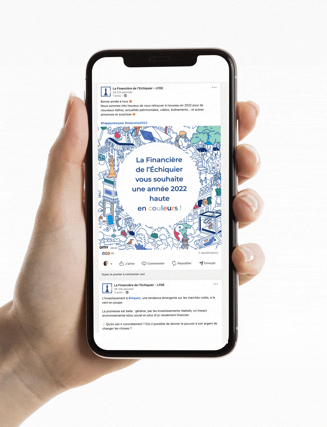 Imaginées et réalisées au sein de La Financière de l’Échiquier, ces cartes et vidéos de vœux sont destinées aux clients en fin d’année. Les animations en motion design, plus corporates, sont déclinées à partir de la carte de vœux papier. Quant à la vidéo, tournée dans les locaux, elle met en scène les commerciaux qui adressent un message plus personnalisé et décalé à leurs clients.