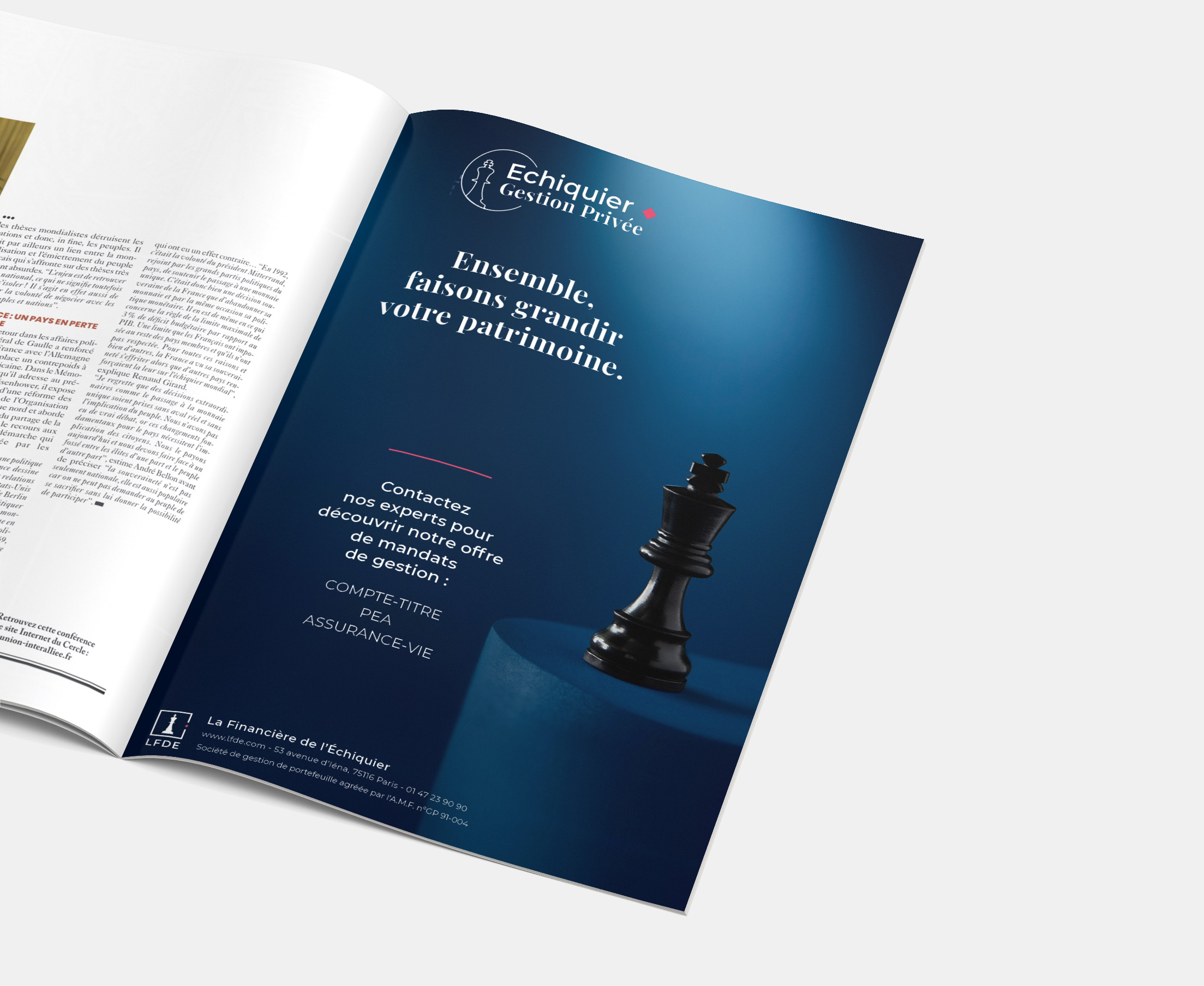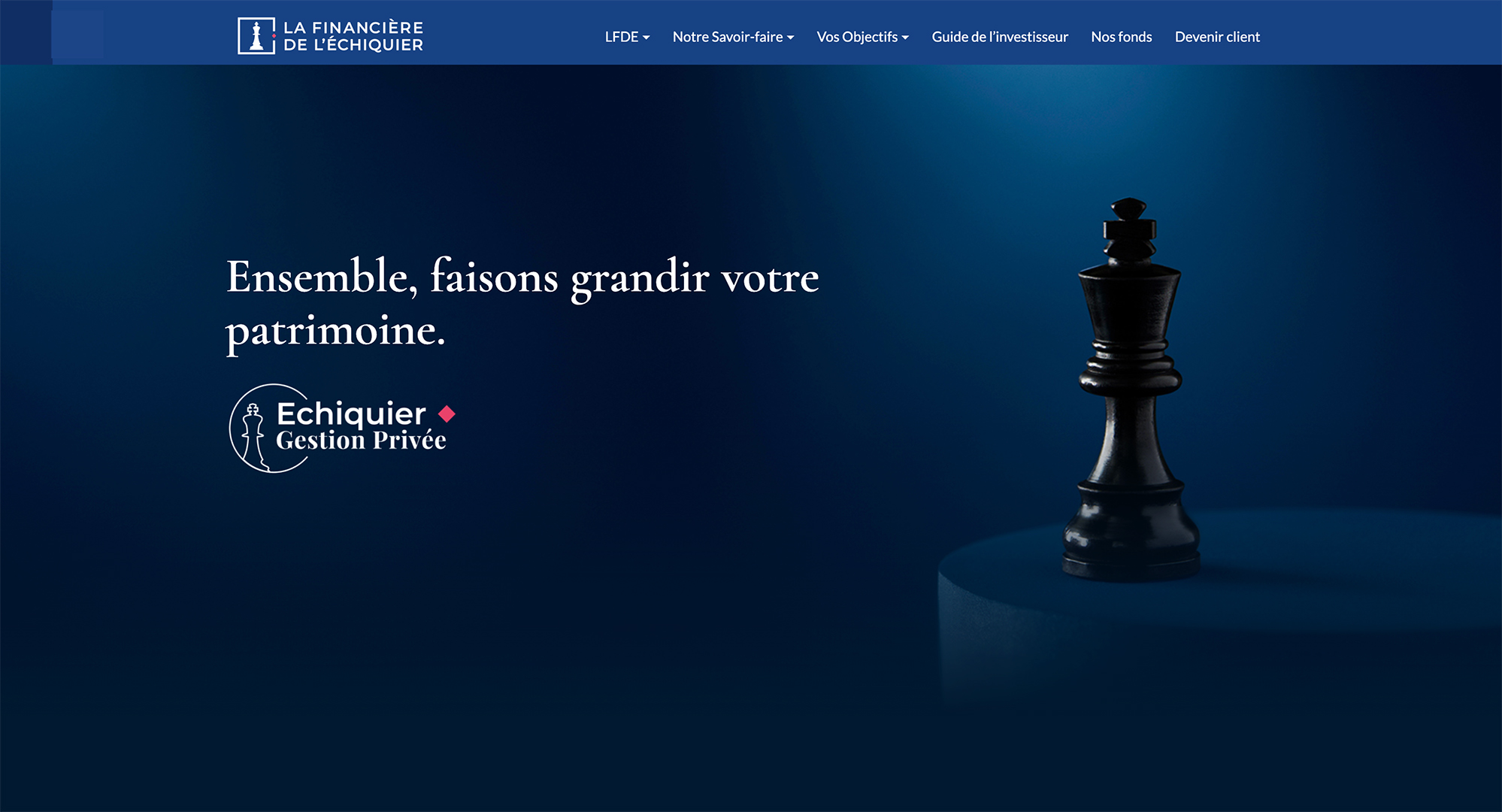 Développée au sein de La Financière de l’Échiquier dans le cadre de la refonte du site internet dédié aux clients particuliers, Echiquier Gestion Privée se positionne comme une marque ombrelle haut de gamme. Du logo jusqu'au spot TV, ce projet a été décliné sur l'ensemble des supports concernés.